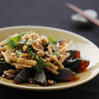 原料:皮蛋、馓子、花生、香菜、生抽、大蒜、辣椒油、醋、盐。