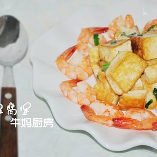 原料:明虾、豆腐、盐、料酒、淀粉、葱花。