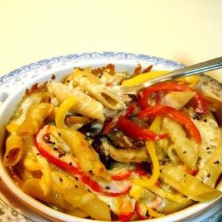 原料:意大利直通粉、口蘑、香菇、洋葱、彩椒、大蒜、马苏里拉奶酪、橄榄油。