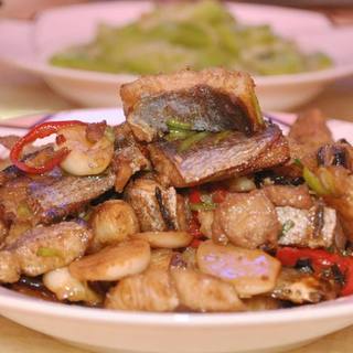 原料:鳗鲞、五花肉、酱油、白糖、鸡精、姜、蒜、葱、辣椒。