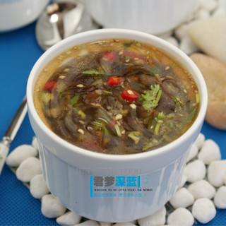 原料:新鲜海蛰、小红椒、大蒜、香菜、熟芝麻、盐、白醋、香油。