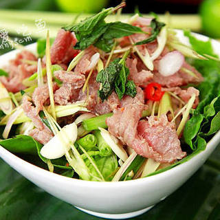 原料:肥牛、柠檬汁、薄荷、香菜、葱、蒜、椒盐、胡椒粉、鸡粉、鱼露、芝麻油、香茅。