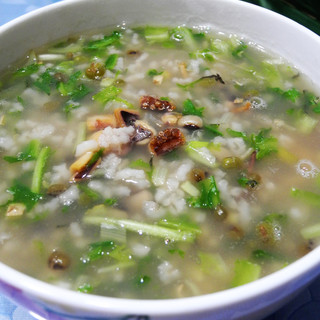 原料:绿豆、糯米、杂豆、鱿鱼干、苦菊、清水、盐。