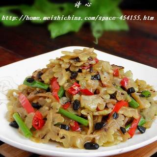 原料:苦瓜、红椒、豆豉、泡椒、生姜、香葱、蒜瓣、食盐、白糖、生抽。