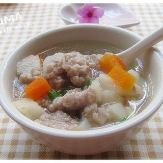 原料:马蹄、胡萝卜、瘦肉、地瓜粉、葱花、味极鲜酱油、盐巴、味精、植物油。