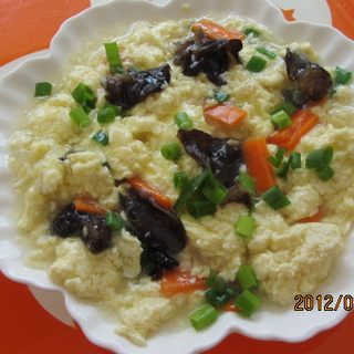 原料:鸡蛋、水发木耳、胡萝卜、绿葱叶。