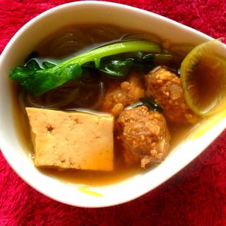 原料:肉馅、豆腐、粉条、姜末、蒜末、葱末、西红柿、油白菜、洋葱、盐、鸡精、酱油、料酒。