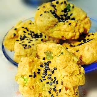 原料:低粉、玉米粉、糖、盐、全蛋、黄油、小苏打、泡打粉、葱花。