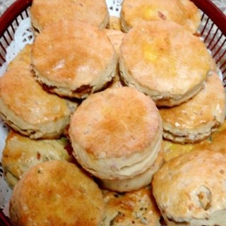 原料:全麦粉、奶酪粉、泡打粉、苏打、盐、细砂糖、奶油、烹调油、鸡蛋、鲜牛奶、麦芽糖、白兰地酒、火腿丝、葡萄干、核桃仁碎。