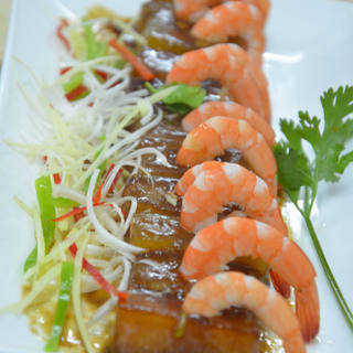 原料:冬瓜、活基围虾、葱末、蒜末、葱姜丝、青尖椒丝、红尖椒丝、味达美酱油、海天蚝油、海天老抽、白糖。