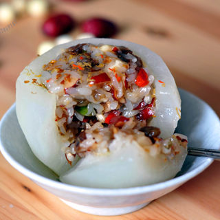 原料:黄金梨、糯米、红枣、核桃仁、桂圆肉、莲子、葡萄干、瓜子、枸杞子、白糖、桂花酱、猪油。