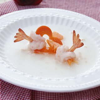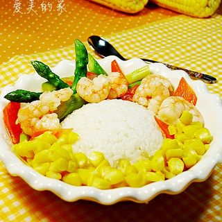 原料:鲜虾、芦笋、胡萝卜、盐、料酒、水淀粉、嫩玉米、米饭。