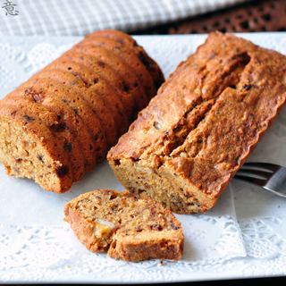原料:低筋面粉、无盐黄油、鸡蛋、细砂糖、红砂糖、香蕉、黑巧克力、榛子仁。