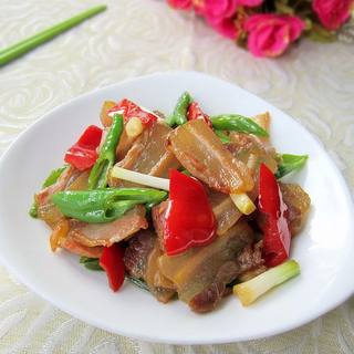 原料:腊肉、青辣椒、蒜苗、红辣椒、植物油、盐、味极鲜、白糖、姜。