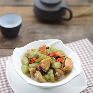 原料:丝瓜、海虹、生姜、大蒜、辣椒、调和油、盐巴、鸡精、料酒、生抽。