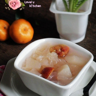 原料:梨、百合、银耳、枸杞、银杏、冰糖。