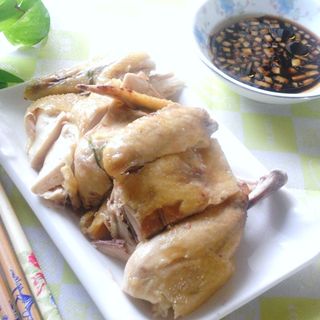 原料:三黄鸡、葱、姜、欣和酱油、白糖、鸡精、芝麻油、姜末。