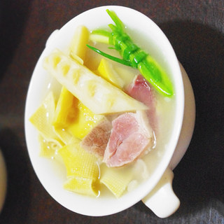 原料:春笋、猪肘子、上海咸肉、咸火腿、豆皮、葱、姜、清水、花雕酒。