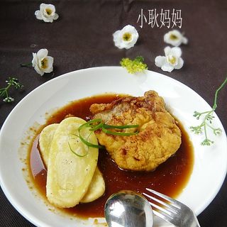 原料:大排、年糕、高汤、鸡蛋、面粉、淀粉、生姜、葱、老抽、生抽、盐、白糖、料酒。