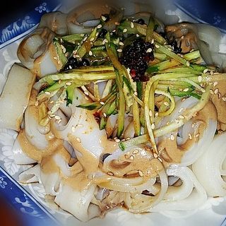 原料:面粉、水、黄瓜、熟芝麻、醋、花椒油、麻酱、辣酱。