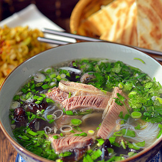 原料:牛肋条肉、牛棒骨、粉丝、木耳、面粉、酵母、食用碱、盐、葱、蒜苗、冰糖、味精、香菜、姜。