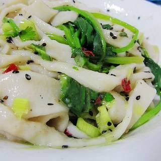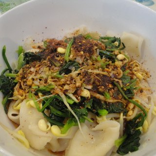 原料:面粉、水、豆芽、菠菜、辣椒面、葱花、姜末、植物油、盐、生抽。