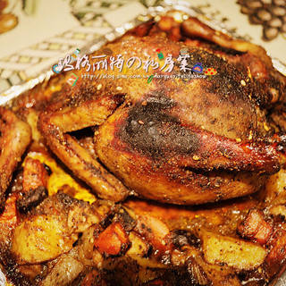 原料:三黄鸡、土豆、洋葱、胡萝卜、香菇、姜末、柠檬汁、黑胡椒粉、烤肉粉、意大利调味料、海鲜酱油、蚝油、白糖、黄油、蜂蜜水。