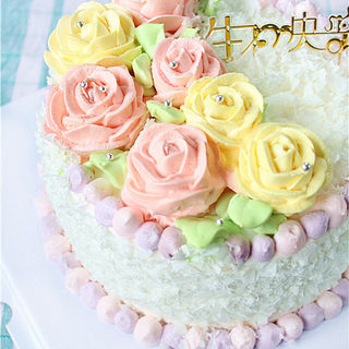原料:6寸戚风蛋糕、淡奶油、水果、蓝莓酱、花生碎、色素。