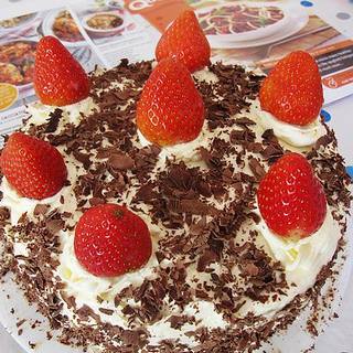 原料:鸡蛋、白糖、油、牛奶、可可粉、面粉、烘焙用黑巧克力、裱花用奶油、巧克力、草莓、黄桃罐头、白糖。