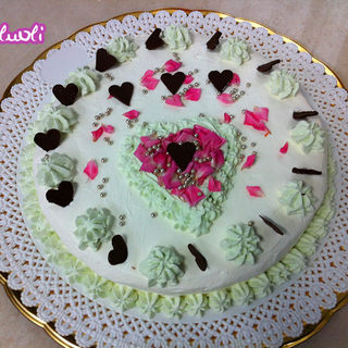 原料:蛋黄酱、鲜奶油、蛋糕体、白糖、绿色糖、玫瑰花瓣、心形巧克力、银色糖珠、朗姆酒糖水。