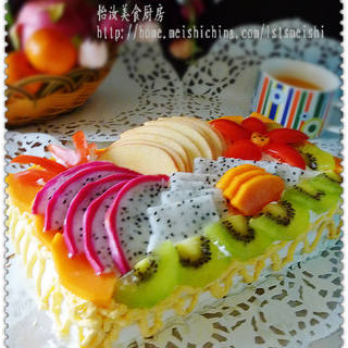 原料:蛋黄、低粉、蛋清、奶油、糖、糖粉、草莓丁、木瓜丁、猕猴桃、木瓜、苹果、火龙果、圣女果、醋、果汁。