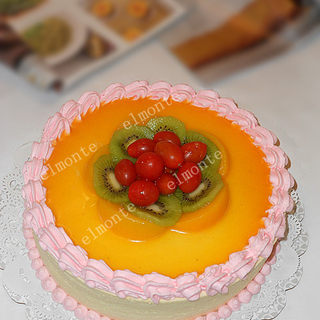 原料:6寸戚风蛋糕、奶油、杂果罐头、黄桃罐头、奇异果、无籽葡萄、黑莓、粉红食用色素、白糖。