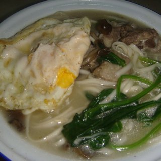 原料:干面条、土鸡蛋、菠菜、盐、排骨汤、鸡精。