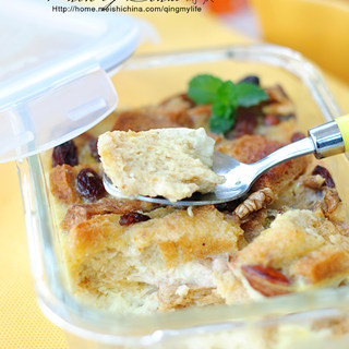 原料:全麦土司、无盐黄油、葡萄干、杏仁、核桃、朗姆酒、牛奶、动物性鲜奶油、细砂糖、香草豆荚、全蛋、蛋黄。