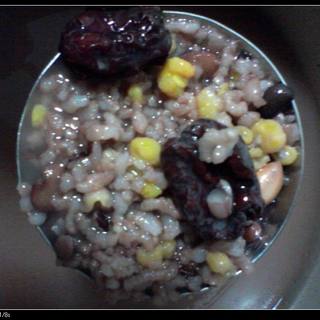 原料:大米、红枣、玉米仁、黑米、红豆、黑豆、花生、葡萄干、冰糖。