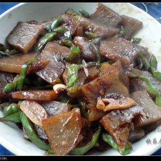 原料:焖子、青椒、葱花、蒜片、盐、老抽、十三香。
