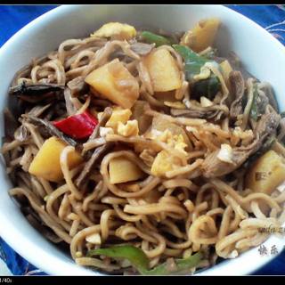 原料:鲜面条、干豆角、土豆、鸡蛋、青椒、蒜末、盐、十三香、老抽。