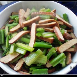 原料:西芹、五香干、蒜片、干辣椒、葱花、盐、生抽、十三香、白糖。