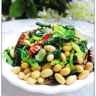 原料:芹菜叶、五香黄豆、干红椒、洋葱、鸡精、盐。
