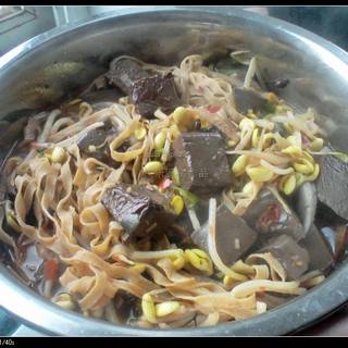 原料:鸭血、豆腐皮、蘑菇、黄豆芽、葱花、姜末、大料、火锅底料。