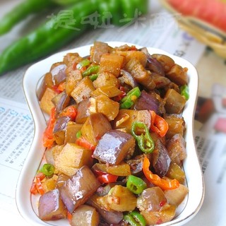 原料:茄子、青辣椒、红辣椒、葱、生姜、大蒜。