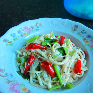 原料:金针菇、辣椒、精盐、食用油、调味鲜、生抽。