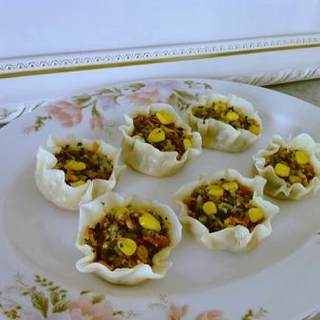 原料:饺子粉、胡萝卜、鸡蛋、香菇、香菜、玉米粒、糯米饭、生抽、盐。