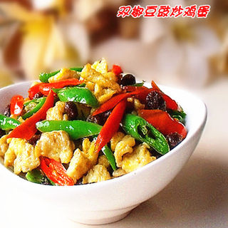 原料:鸡蛋、豆豉、红尖椒、青尖椒、葱花。
