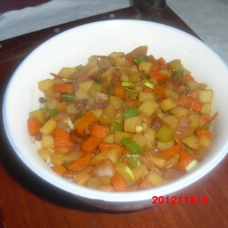 原料:米饭、洋葱、土豆、胡萝卜、青笋、青椒、西红柿、杏鲍菇、葱、盐、老抽、糖、鸡精。
