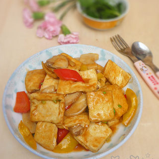 原料:豆腐、杏鲍菇、红椒、黄椒、香菜梗、姜、盐、烹调油、生抽、蕃茄酱、淀粉。