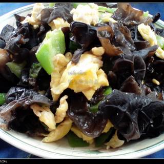 原料:黑木耳、鸡蛋、青椒、葱花、盐、鸡精。