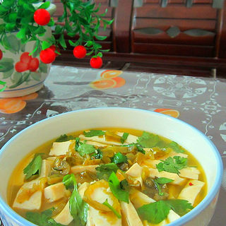 原料:豆腐、酸辣椒、香菜叶。
