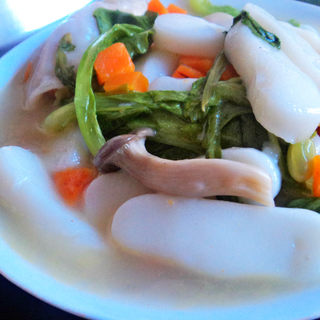 原料:年糕、胡萝卜、蟹味菇、茼蒿、生菜、油、盐、胡椒粉、醋。