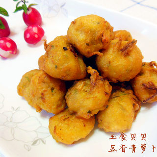 原料:青萝卜、豆渣、面粉、葱、盐、五香面、食用油。